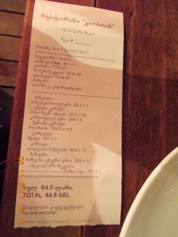 Счет на 15 лари должен быть дешевле - ошиблись официанты :-) Лишнее вернули. |